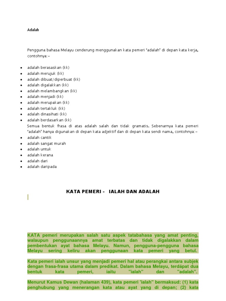 Pics. Lazimnya kata kerja menunjukkan sesuatu perbuatan atau keadaan melakukan sesuatu.contohnya, berjalan, makan, memakan, dimakan dan sebagainya. Kata ialah = penghubung di antara dua penggal kalimat yg menegaskan perincian atau penjelasan atas penggal yg pertama itu adalah = identik dengan,sama maknanya dengan, termasuk dalam kelompok atau golongan.