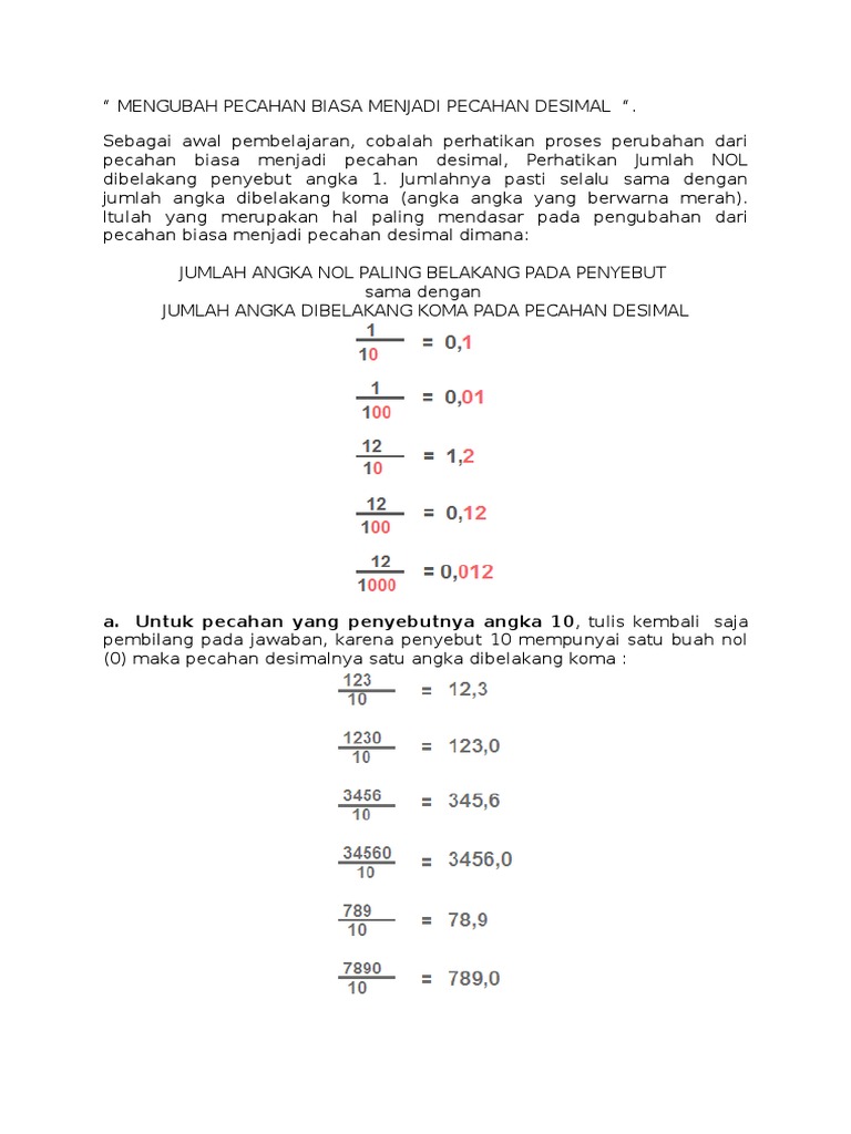 Cara mengubah pecahan ke desimal. Maka penyebutnya dapat dijadikan 10 dengan cara mengalikan bilangan 5 dengan 2. Terdapat empat bentuk pecahan untuk jenjang. Cara pertama dengan mengubah penyebut menjadi 100 karena persen adalah perseratus.