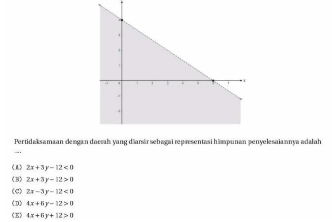 Pics. Langkah pertama adalah menggambar garis x + y =6, 2x + 3y = 12, x = 1, dan y = 2. Daerah yang diarsir merupakan penyelesaian dari pertidaksamaan.