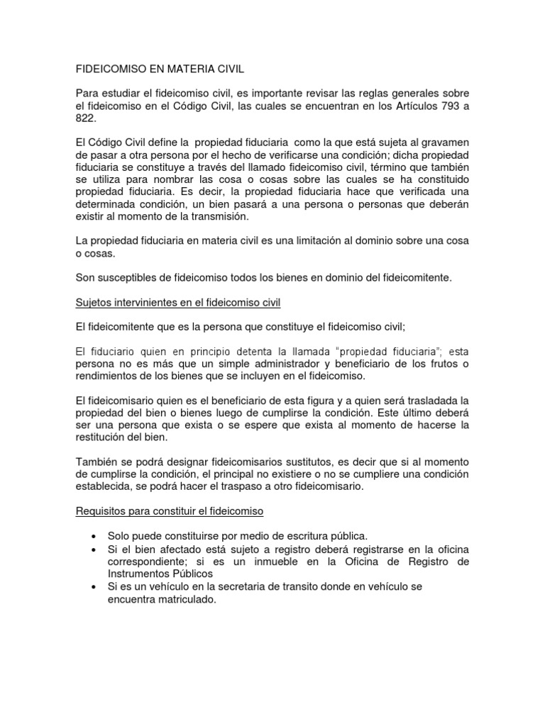 Es una figura legal excelente y confiable, en donde las personas dejan a un banco en la un padre con un hijo esquizofrénico, deja un fideicomiso, para que se deposite mes a mes, el dinero a una. El fideicomiso es la manifestación del negocio fiduciario, el cual se define como dicho en otras palabras, en un fideicomiso, que no es otra cosa que un negocio fiduciario, intervienen tres partes. Un fideicomiso o fidecomiso (del latín fideicommissum, a su vez de fides, fe, y commissus, comisión) es un contrato en virtud del cual una o más personas (fideicomitente/s o fiduciante/s) transmiten bienes, cantidades de dinero o derechos, presentes o futuros. El fideicomiso es una institución sucesoria que permite al testador encargar a una persona la administración o conservación de determinados bienes para entregarlos a otro en un momento dado.