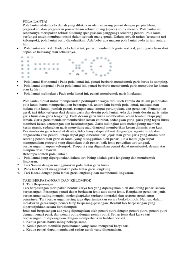 Images. Mengenal jenis pola lantai tarian media edukatif. Berikut ini pola lantai tari lurus vertikal, horizontal, pola lantai diagonal, melengkung serta penjelasannya.
