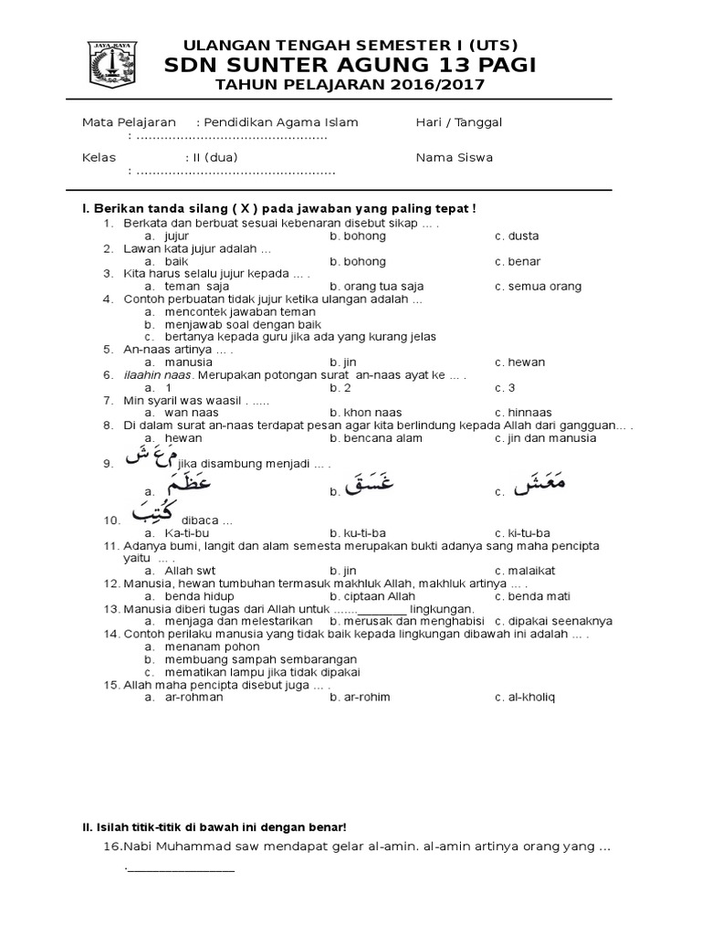 Soal uts agama islam pai untuk kelas 2 yang terdiri dari 20 soal pilihan ganda, 25 soal isian dan 5 soal pertanyaan. Soal kelas 2 mapel pa islam. 17.salah satu sifat allah swt adalah. Takbir pertama kali dalam sholat dinamakan _.