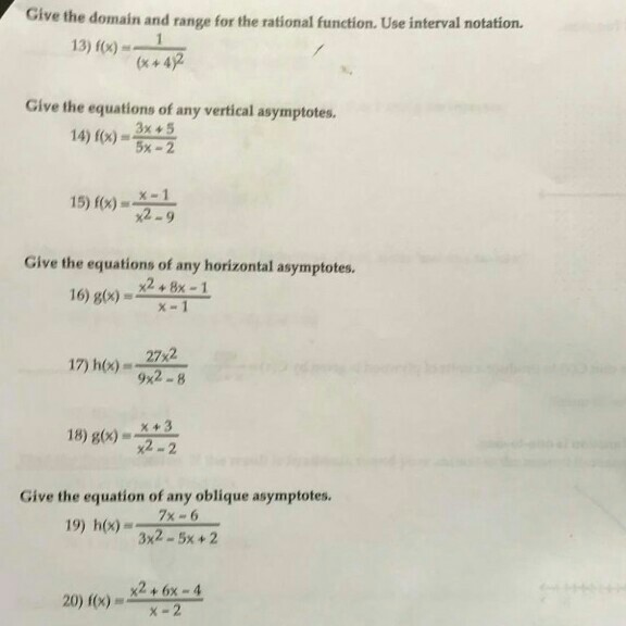 Gallery. For a rational function, the denominator cannot be zero. Write your answer using interval notation.