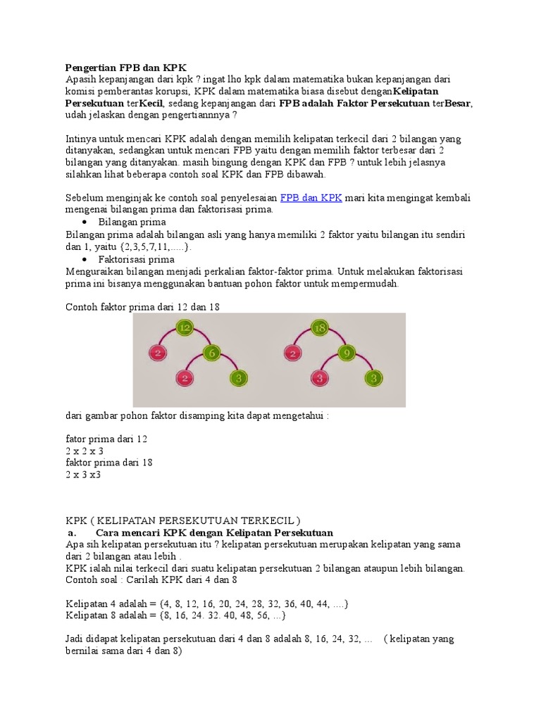 Masukkan nilai itu ke dalam salah satu dari dua persamaan yang dibuat dalam langkah 4 dan 5 yang hanya memuat dua variabel, dan selesaikan variabel kedua. Nah, coba perhatikan perkalian di bawah ini untuk memahami apa itu fpb dan kpk. Dalam pembelajaran matematika di sd merupakan salah satu kajian yang menarik untuk untuk melaksanakan pendekatan kontekstual dapat diterapkan dalam kurikulum apa saja, bidang studi 3.2 saran dalam menanamkan konsep kpk dan fpb kepada siswa, guru harus mampu menciptakan. Sedangkan kpk, kepanjangan dari kelipatan persekutuan terkecil adalah kelipatan terkecil dari bilangan yang dicari kpk nya.