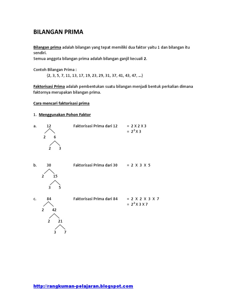 Bilangan prima adalah bilangan yang nilainya lebih dari 1, tidak mempunyai faktor lebih dari 2, berikut contoh dan cara menentukannya dengan mudah. Perhatikan bahwa 1 bukan merupakan bilangan prima karena ia hanya mempunyai satu faktor. Berikut ini adalah cintoh soal tentang faktor prima dan bilangan prima beserta pembahasannya. Definisi bilangan prima adalah bilangan asli yang lebih besar dari 1 dan hanya bisa dibagi oleh 2 bilangan yaitu satu dan bilangan itu sendiri.